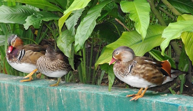Mandarin-Duck-Itik-Mandarin-Aix-galericulata-2-young-males-with-female-in-centre-KLBP