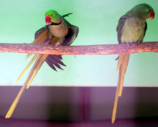 Alexandrine-Parakeet-Psittacula-eupatria-Alexandrian-Parrot-Male-on-left-Ballarat-Bird-World-VIC